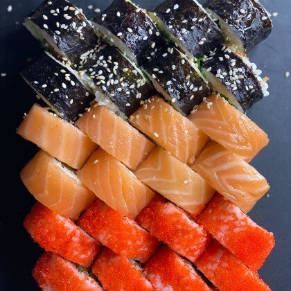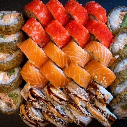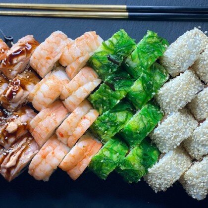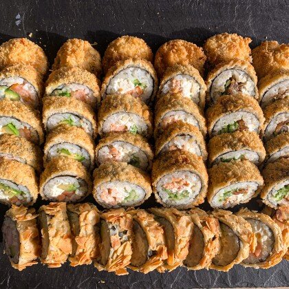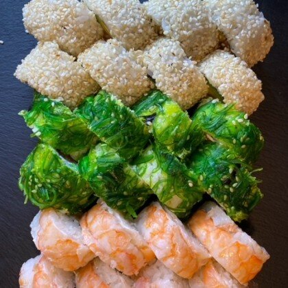 Filadelfia z łososiem i truskawka Tęcza z łososiem, tuńczykiem, krewetką, serkiem i ogórkiem Zielona z krewetką, awokado i serkiem Tempura z łososiem pieczonym i awokado z serkiem
