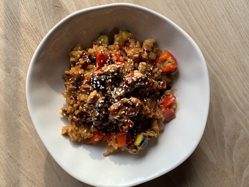 Ryż Mieso z uda kurczaka Pieczarki Papryka Cukinia Cebula Sos sojowy Sos teriyaki Sezam
